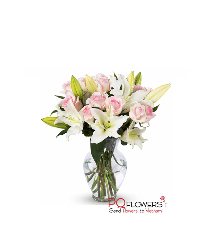 Peaceful -Pink Roses and Lilies 7210 ,  includes 10 white lilies, 10 pink roses .